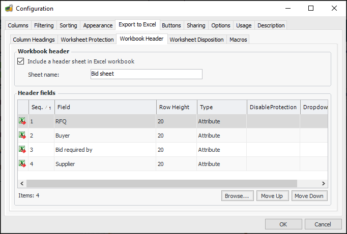 • Open the configuration “RFQ bid information for export to Excel”. Select the Export to Excel tab and then the Workbook Header tab. For example: