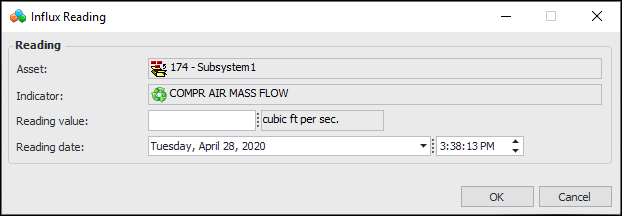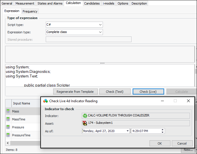 You can add readings to InfluxDB to test 4D calculated indicators using the Check (Live) feature. In the Indicator window of the calculated indicator, select the Calculation tab. For each input based on readings, open the indicator (double-click its icon in the input table).Logging Templates for 4D Indicators Calculations
