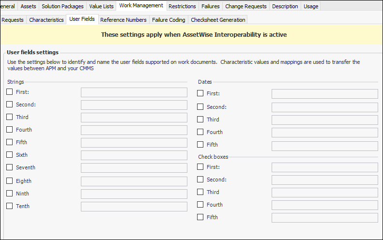 • Set the options for requests for work that do not reference a solution package and those that do (select the Trigger Requests tab).User-defined properties are shown in the work documents’ Details tabs.Note: To use this functionality in APM, you must enable feature 48. In the Enterprise window, select the Customization Center view and the Enabled Features tab. Click Browse, select “Support for user-defined fields on AssetWise Interoperability Work Documents”, and click OK. If APM is running as a smart client, click Refresh Enabled Features on the server. Then restart the client to use the functionality.AWEIS – Checksheet Generation Date