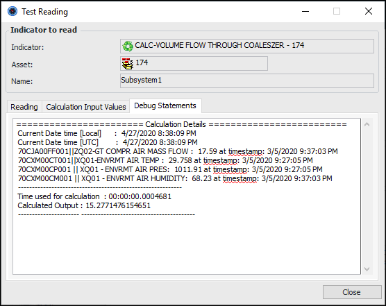 When developing 4D calculated indicators, you can test calculation inputs using readings retrieved from the Influx database. In the Indicator window, Calculation tab, click Check (Live). The Check Live 4D Indicator Reading dialog appears, showing the current date and time.Select the Calculation Input Values tab to see the input values.If the calculation formula specifies written output, the Debug Statements tab shows the result. For example:Create Influx Readings to Test Calculations