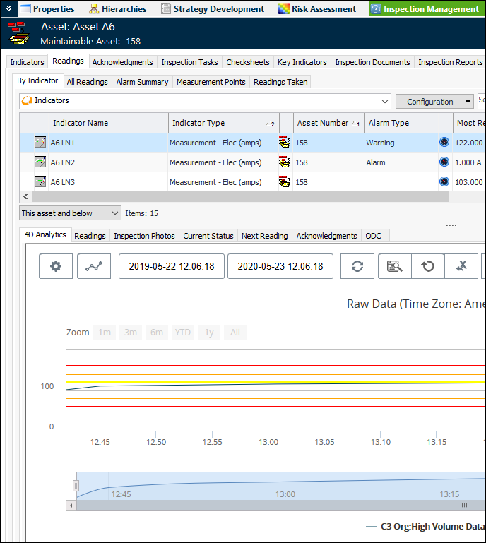 In the Site window, Inspection Management view, select the Indicators tab and the Listing tab. In the list of configurations, select “4D Analytics indicators”. The table lists the indicators by asset and includes the 4D Analytics IDs. For example:In the Asset window, Inspection Management view, select the Indicators tab. Both the Listing and By Asset tabs provide 4D Analytics indicators configurations.Select the Readings tab and then the By Indicator tab. Select a 4D indicator in the top table to view the 4D Analytics chart below:Browse for 4D Calculation Indicator Input