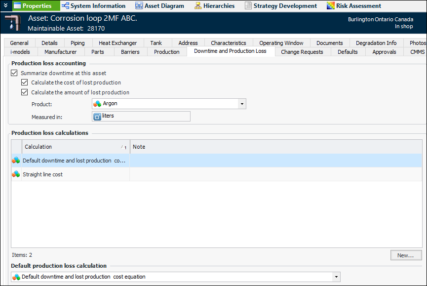 In the Asset window, the Downtime and Production Loss tab is used to summarize downtime for the asset, calculate the amount and cost of lost production, and add production loss calculations to the asset and product. For example:This tab’s availability is controlled by the asset type. In the Asset Type window, Policies tab, the Performance tab has been replaced by separate Downtime and Production tabs.The Production tab allows you enable production loss accounting rules for basic production loss accounting. When the option is selected, the Downtime and Production Loss tab is available for assets of that type.When Production loss events can be reported against assets of this type is selected, the Production tab is available for assets, showing products, calculations, and cost intervals.Related Asset on Production Loss Events and Downtime Incidents