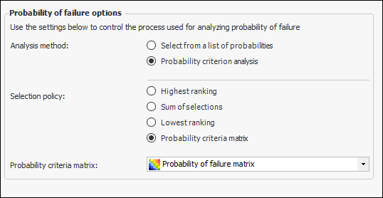 • Lowest ranking – Of the examples the user chooses during the analysis, the one with the lowest score is selected. The score is matched to a probability of failure