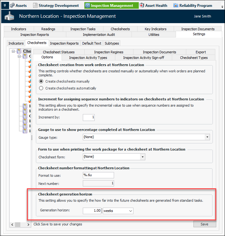 Note: This functionality is available as a Technology Preview. To use it in APM, enable feature 51. In the Enterprise window, select the Customization Center view and the Enabled Features tab. Click Browse, select “Support generation of checksheets for standard tasks, without requiring a work order”, and click OK. If APM is running as a smart client, click Refresh Enabled Features on the server. Then restart the client to use the functionality.In APM the functionality is enabled in the standard task’s due-date tracking settings. You can select Generate checksheet when due. For example:The checksheet generation horizon for standard tasks is set to one week by default. You can change it by selecting the Inspection Management view, Settings tab, Checksheets tab, and Options tab:Work Order Status Controls Checksheet Generation
