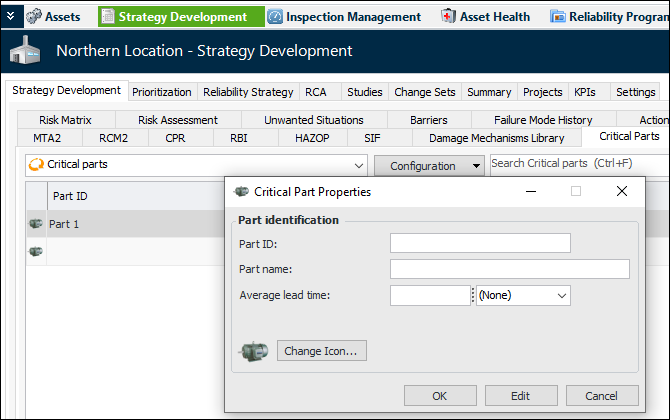 In the Maintenance Action Plan window, Implementation view, select the Critical Parts tab and click New. The Action Plan Part Requirement dialog appears:In the Strategy Development Analysis window, you can select the Analysis Summary view, Critical Parts tab to see a list of the parts for all of the action plans in the analysis.You can maintain a parts catalog in the Site window, Strategy Development view and tab, Critical Parts tab. For example:Note: To use this functionality in APM, you must enable feature 42. In the Enterprise window, select the Customization Center view and the Enabled Features tab. Click Browse, select “Support for critical parts identification on a maintenance action plan”, and click OK. If APM is running as a smart client, click Refresh Enabled Features on the server. Then restart the client to use the functionality.Table Configurations