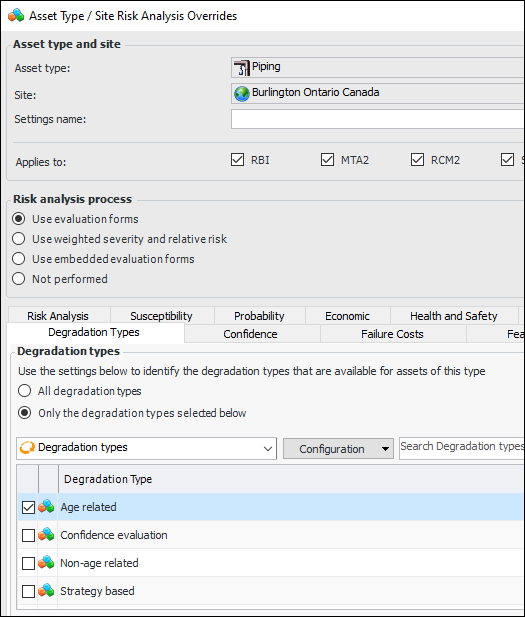 1. You can now limit the degradation types available for an asset based on its asset type. To set this up: Open the Asset Type window and select the Strategy Development tab and the Risk Analysis tab.