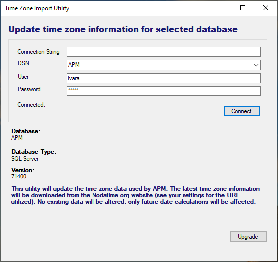 6. Click Connect. When the utility successfully accesses the APM database, “Not Connected” is replaced by “Connected”, database information is added to the dialog, and the Upgrade button is enabled. For example: