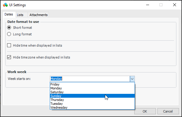 2. In the UI Settings dialog, Dates tab, change the “Work starts on” selection: