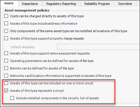 • Create or update asset types to support circuits. In the Asset Type window, select the Policies tab and then the Assets tab. In the Asset management policies area, click one or both circuit options. If assets of this type represent a circuit, you can specify whether installed component assets can be included in the circuit. For example: