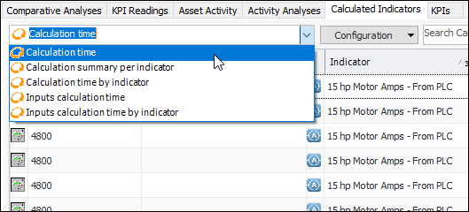 On the Site window, select the Analytics view and the Calculated Indicators tab. The configuration list provides these ways to view the information: