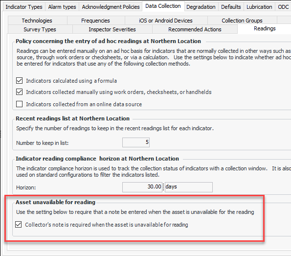 1. On the Site window, select the Inspection Management view, Settings tab, Indicators tab, Data Collection tab, and Readings tab.