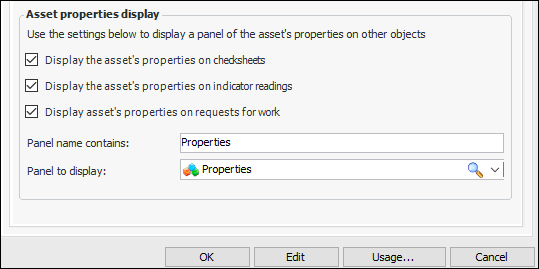 The Asset Type window provides settings to display a set of asset properties in any of checksheets, indicator readings, and requests for work. An Asset Properties view (on Checksheet) or tab (Indicator Reading and Request for Work) is added to the user interface if the asset’s asset type has enabled support for displaying asset properties.In the Asset Type window, you will find the options on the Policies tab, Assets tab at the bottom of the tab. For example:Below is an example of an indicator reading window with the Asset Properties tab. The panel assigned to the asset type is “Properties general information”.Note that, in this example, you can initiate an asset properties change request by clicking New Change Request.This example shows the Checksheet window, Asset Properties view when the panel to display is “General properties tab sub notebook”.Note: This functionality is available as a Technology Preview. To use it in APM, you must first enable feature 65. In the Enterprise window, select the Features view and the Enabled Features tab. Click Browse, select “Display asset properties on selected objects”, and click OK. If APM is running as a smart client, click Refresh Enabled Features on the server. Then restart the client to use the functionality.Work Document Creation for Non-Alarm Readings