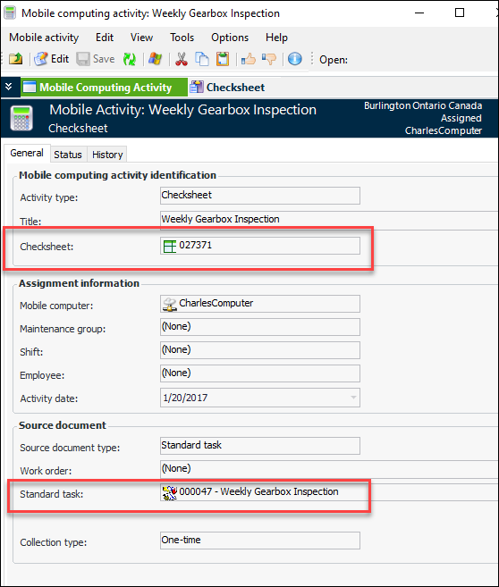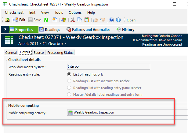 The Checksheet window displays the mobile computing activity. In the Properties view, select the Details tab:
