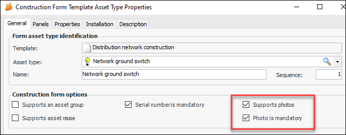 In construction form templates, you can specify that a photograph must be added to construction form details based on asset type. In the Construction Form Template Asset Type Properties window, General tab, select Supports photos and Photo is mandatory. For example:Construction Form Activities: Photos and Attachment Tabs