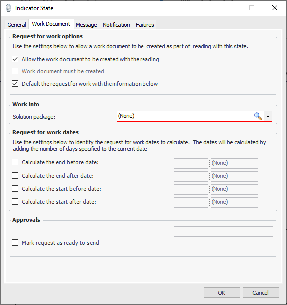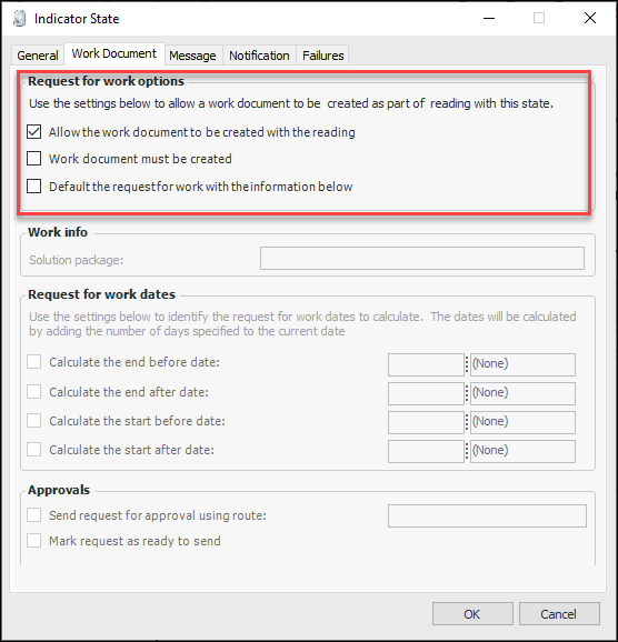 On an indicator state, you can select the Work Document tab to specify default information for the request for work. This functionality is available for alarm states and non-alarm states when the creation of work documents is allowed.In the Indicator State window, select the Work Document tab, and select Default request info for work info. For example:When you enter an indicator reading, the Work tab is available if the indicator state requires it. If work document is mandatory (on a non-alarm state), Create work document is selected and read-only. Default information from the indicator state’s default work document info and the default solution package is displayed. For example:When you are acknowledging an alarm, the Acknowledgment tab displays the Work document details area, which displays the default information for the request for work. For example:Link Checksheets to Interop Work Requests
