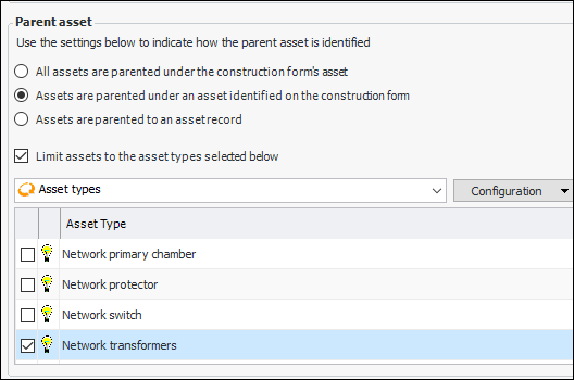 • Assets are parented under an asset identified on the construction form – When creating a form, you can select from the other form details. When assets are created or updated from the form, the child asset is associated with the selected parent