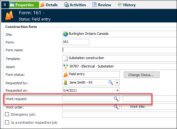 You can now make it mandatory for users to identify the interop work request on construction forms. In the Construction Form Template Header window, select the Details tab and then Work request. For example:In the Construction Form window, you can browse for interop work requests in the Properties and Details views. For example:Specifying Parents for Construction Form Detail Assets