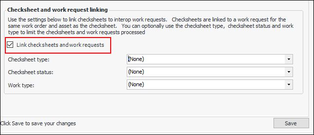7. Click Save.You can run the process manually (for example, to test your settings) by clicking the Tools menu, Inspection Management, and then Link Checksheets to Work Requests. To have the process run on a regular basis, set up the Link Checksheets to Work Requests scheduled action. For more information, see Creating a Scheduled Action.