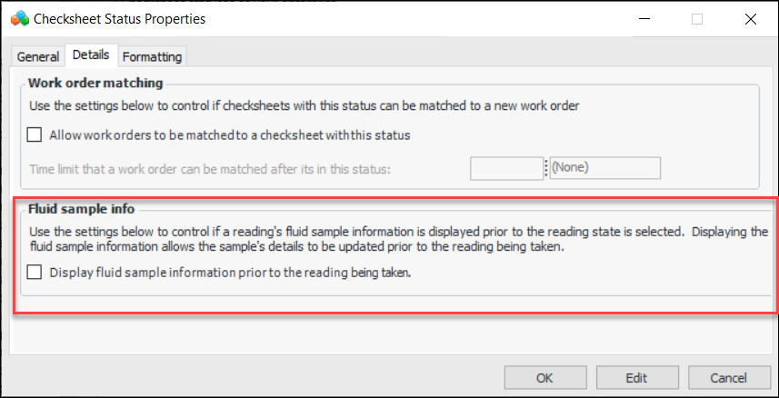 An option on the checksheet status controls whether the Fluid Sample tab is initially displayed on indicator readings. If the option is selected, the user can update the fluid sample information before selecting the indicator state.The Fluid Sample tab is displayed, whether the option is selected or not, once a state has been selected for the reading.To update Checksheet Status, select the Inspection Management view, Settings tab. Select the Checksheets and Checksheet Statuses tabs. Open the Checksheet Status window and click Edit. The option is on the Details tab:Inventory – Warehouse – Storage Location Formatting