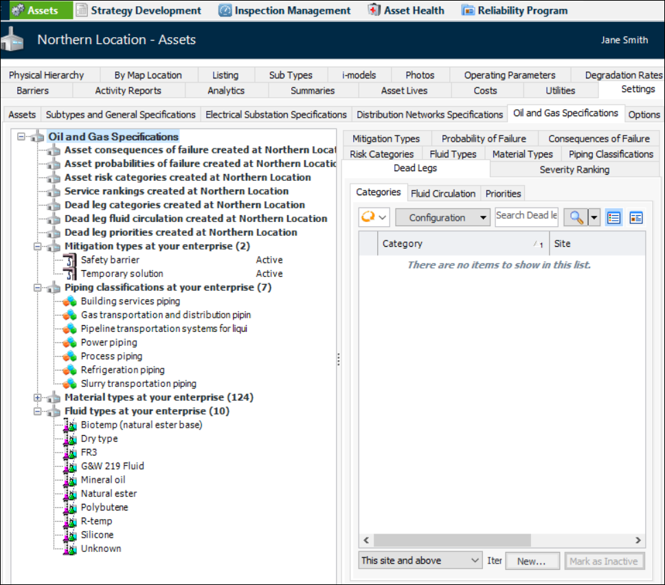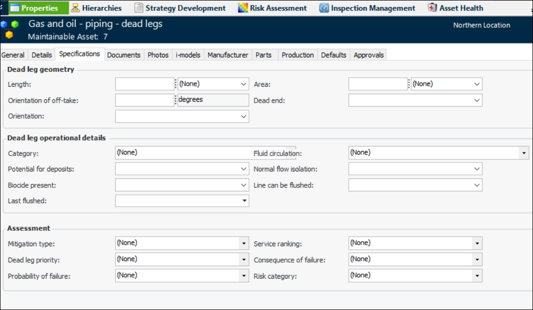 Note: Support for dead leg specifications is a “generally available” product feature. You must first enable feature 96, as well as 91, to use the functionality in APM. In the Enterprise window, select the Features view and the Enabled Features tab. Click Browse, select “Support for Dead Leg Piping section asset specifications” and click OK. If APM is running as a smart client, click Refresh Enabled Features on the server. Then restart the client to use the functionality.To use the specification, add it to an asset type and select the panel “Asset specifications - Oil and Gas - Dead leg piping”. Assets of the type display the Specifications tab on the Asset window, Properties view. For example:Distribution Networks Asset Specifications