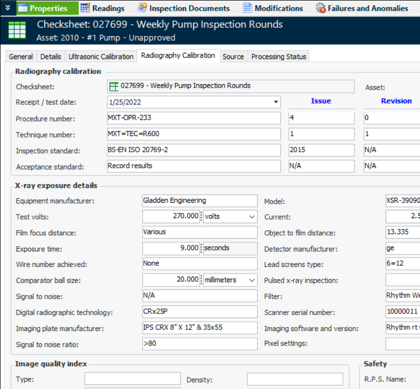 This release introduces checksheet subtypes for Radiography and Ultrasonic calibration. When a subtype is assigned to a checksheet type, checksheets of that type display a Calibration tab. For example, here is a Radiography Calibration tab:Checksheet Export – Collected By