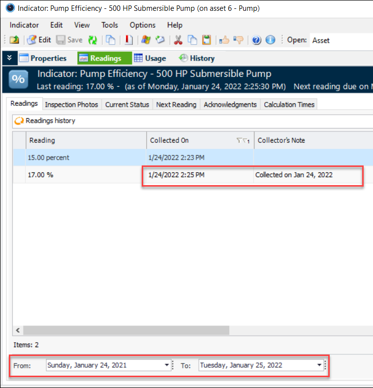 • To: tomorrowThis change ensures that a reading entered today is always listed in the Readings tab. For example:APM Remote Indicators Support States Based on Calculations
