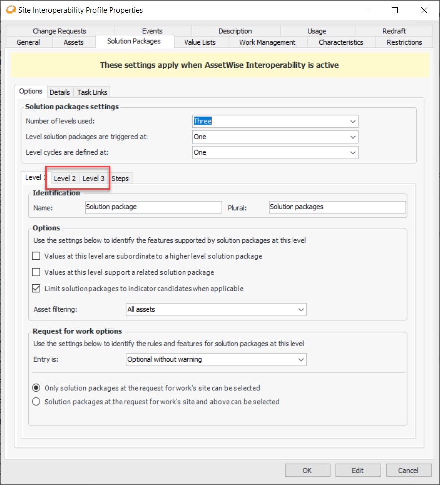 In the Site Interoperability Profile window, specify how solution package levels will be used at the site. For example, if you choose three levels, Level 2 and Level 3 tabs are added so that you can specify options for each level:Click the Steps tab to select the level that supports steps and provide a name that will be used in the user interface.Interop Work Documents and Solution Package Levels