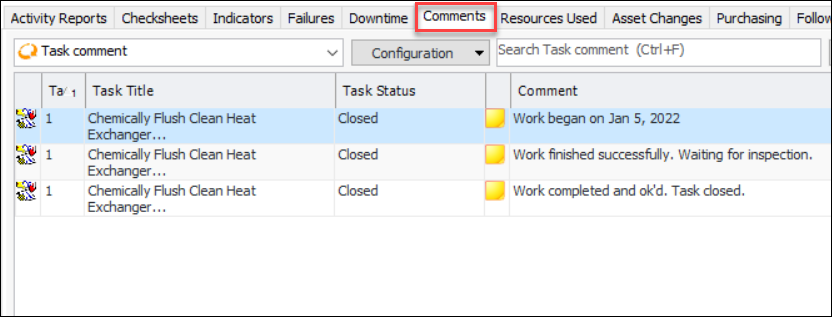 Activity report comments are now displayed in the work order’s Activity view. For example:In the Work Order window, Activity view, comments are displayed under the Comments node in the Work Order tree and in the Comment column in the Activity Reports tab.