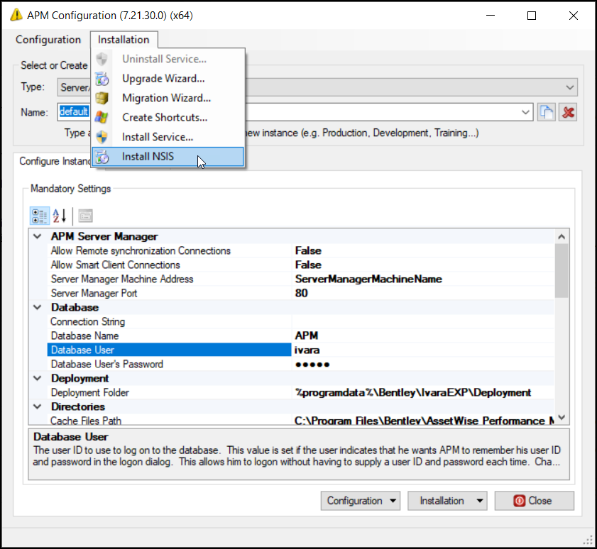 After installing APM 7.19 (or later) on a computer where an earlier version of APM has not been installed, you can install NSIS from APM Configuration. Run APM Configuration as an administrator. In the Installation menu or list, click Install NSIS.Environment Password and ODC Data