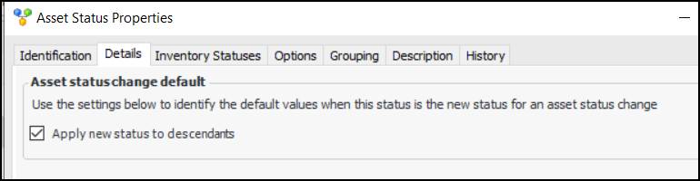 Apply new status to applicable descendants is selected by default. You can clear this option to prevent the change to child assets.To change the default selection in the Change Asset Status dialog, clear the Apply new status to descendants option in asset statuses:Note: The option to not apply the status to descendants is generally available. You must first enable feature 106 to use the functionality in APM. In the Enterprise window, select the Features view and the Enabled Features tab. Click Browse, select “Provide an option to limit an asset status change to the current asset only” and click OK. If APM is running as a smart client, click Refresh Enabled Features on the server. Then restart the client to use the functionality.Asset Category and Class of Asset – New Asset Properties
