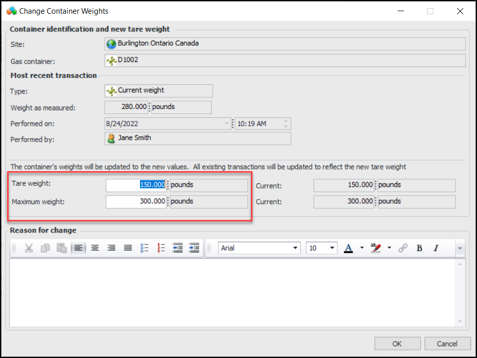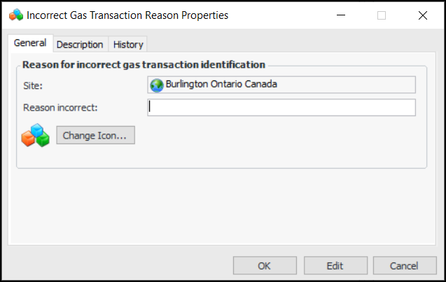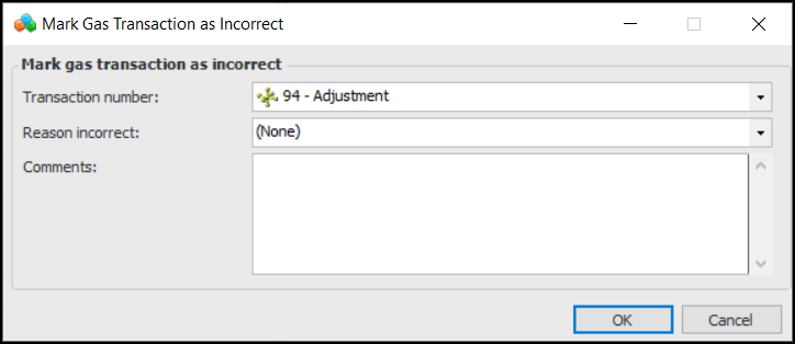 To mark a transaction as incorrect, locate the transaction in a table, for example, transactions By Container. Right-click the transaction and click Mark as Incorrect. (The option is only available for the container’s most recent transaction.) The Mark Gas Transaction as Incorrect dialog appears:Once the transaction is marked incorrect, you cannot change any of its properties. It is displayed as scored through in tables. In the Gas Transaction window, select the Incorrect Transaction Info tab to view the reason, comment, and so on.You can set up reasons for marking transactions as incorrect. In the Site window, select the Regulated Gas Management view and the Settings tab. Select the Incorrect Transaction Reasons tab and click New.Change Gas Container Maximum Weight