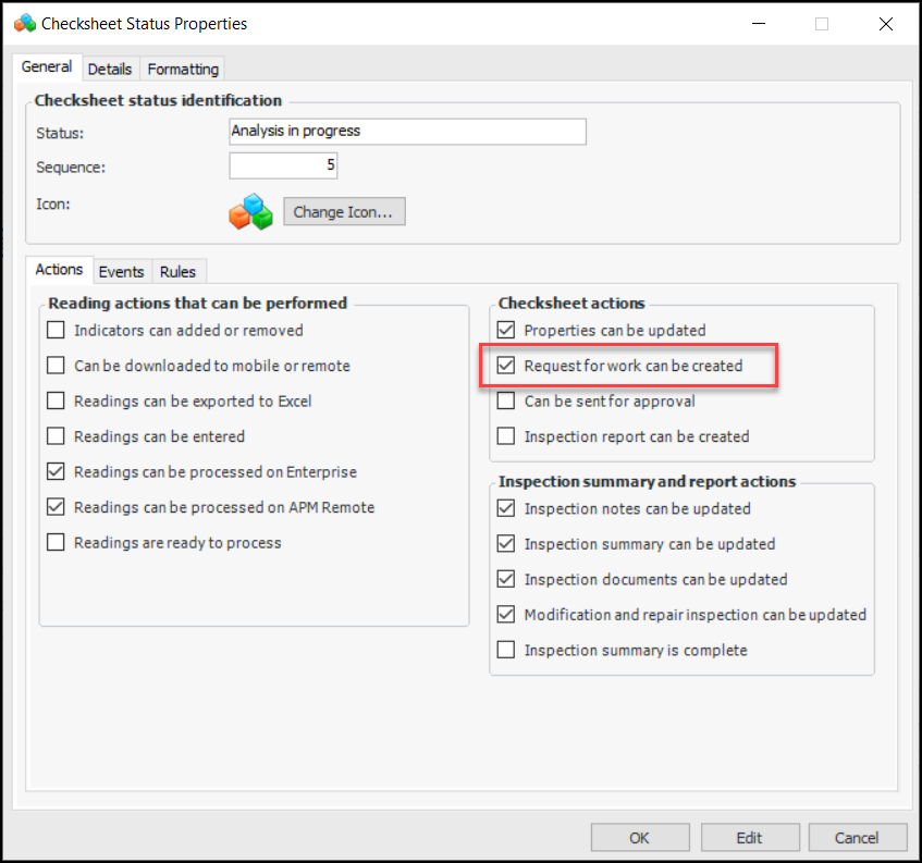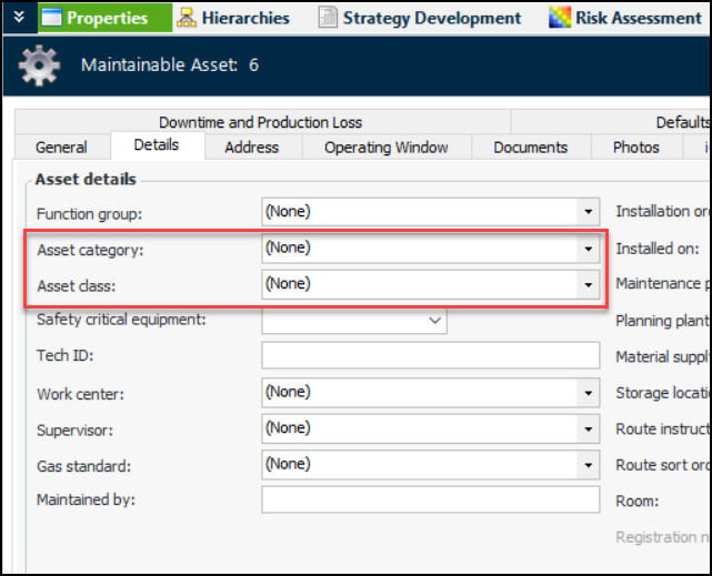 Two new properties are now available in the Asset window, Properties view, Details tab: Asset category and Asset class. For example:AWEIS – Create Requests for Work from Checksheets
