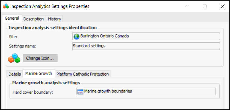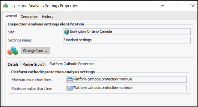 You can use the new “Dashboard - Indicator Analytics Platform Cathodic Protection” site panel in the Analytics tab and other dashboards to display point style charts of measurement point readings with the platform cathodic protection subtype. One chart shows the maximum reading and the other the minimum reading. Depth and Reading are the chart co-ordinates.You can also set up boundary lines to highlight readings outside of normal points. Define the chart lines in the Charts tab and add them in the Inspection Analytics Settings dialog, Platform Cathodic Protection tab:Survey Types – Platform, Fabric, and Subsea Inspections