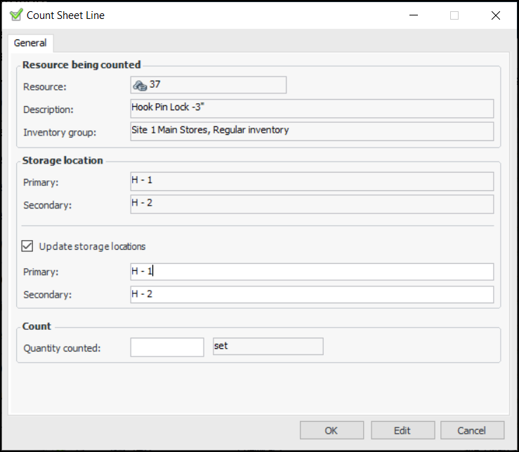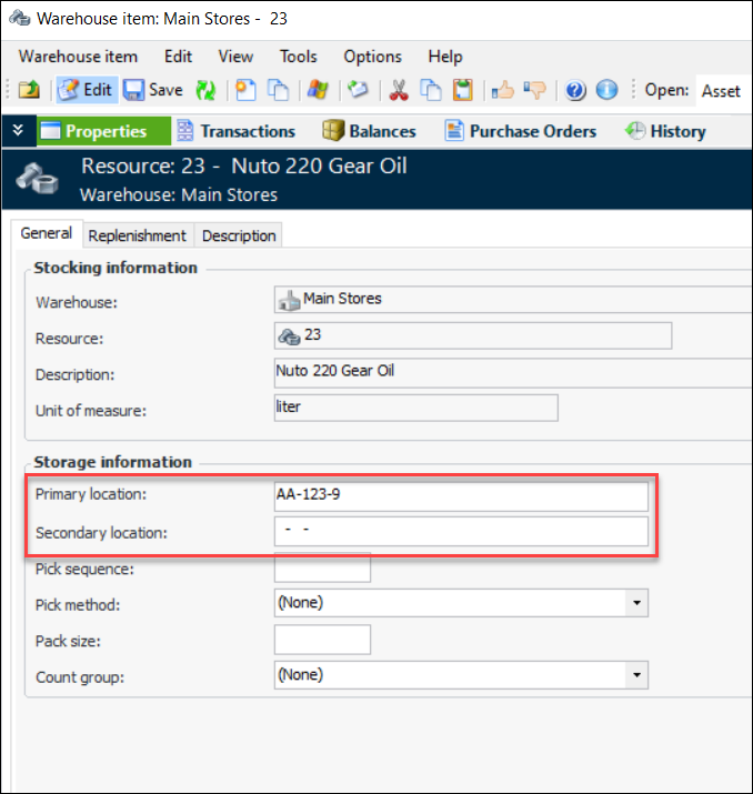 When entering inventory counts in an APM count sheet, you can now also update the primary and secondary storage locations for the resource. In the Count Sheet Line dialog, select Update storage locations and enter a location in the Primary box, Secondary box, or both. For example:Note: The update storage location functionality is generally available. You must first enable feature 105 to use the functionality in APM. In the Enterprise window, select the Features view and the Enabled Features tab. Click Browse, select “Support the ability to update a warehouse item’s storage locations when counting the item” and click OK. If APM is running as a smart client, click Refresh Enabled Features on the server. Then restart the client to use the functionality.Warehouse – Storage Location Formatting