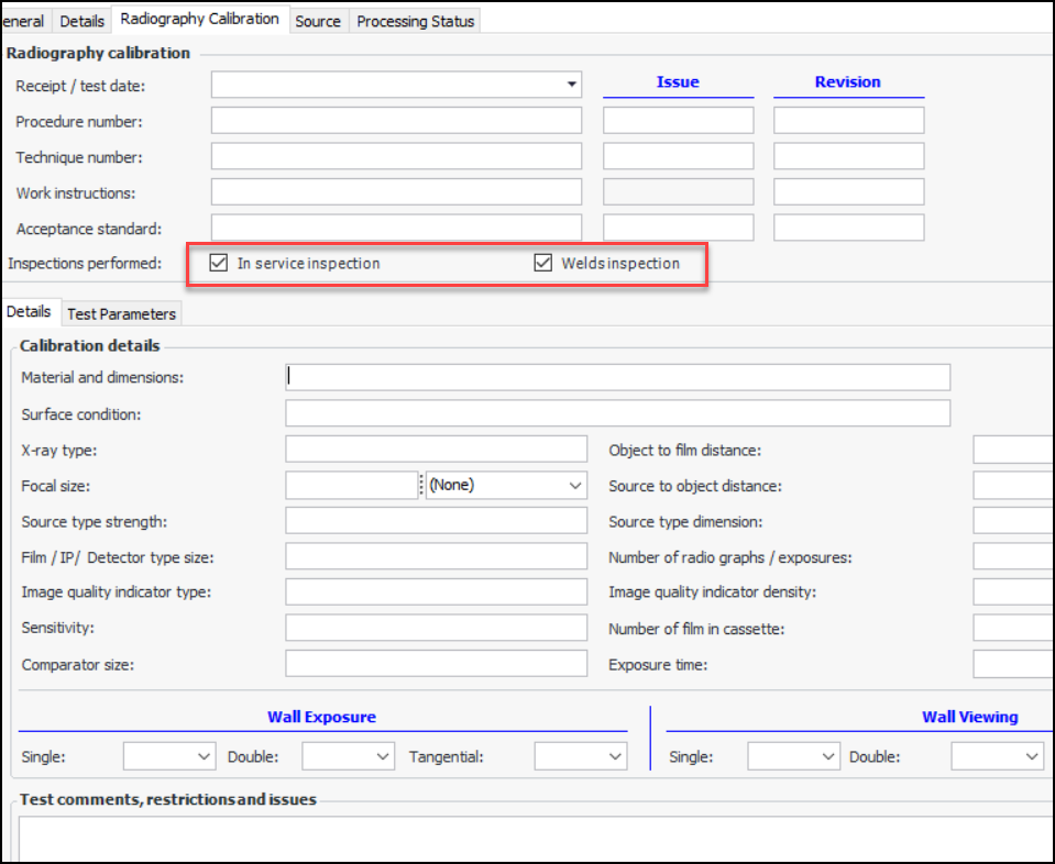 The Ultrasonic Calibration and Radiography Calibration checksheet subtypes introduced in a previous release have been enhanced. When a subtype is assigned to a checksheet type, checksheets of that type have the option of displaying a Calibration tab in the Properties view. Now, in-service inspection and weld inspection versions are available in both subtypes. For example, here is the Radiography Calibration tab when both versions are enabled:Checksheet Subtypes – DPI, ECI, MPI