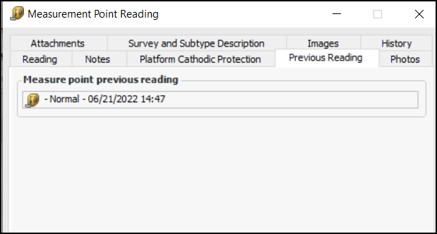 When a measurement point reading is processed, its previous reading is now recorded on the current reading. In the Measurement Point window, select the Previous Reading tab to view the reading:The Previous Reading tab is only displayed when a previous reading exists.APM Remote and Descriptive Measurement Points