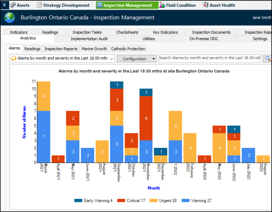 You can set up the new Analytics tab in the Site window, Inspection Management view to display a variety of information, ranging from alarms, readings, and inspection reports to marine growth and platform cathodic protection. You can also specify the time period (in days, weeks, months, or years) for the data.For example, here is the Analytics tab with the full complement of sub-tabs:The Alarms tab offers configurations for:
