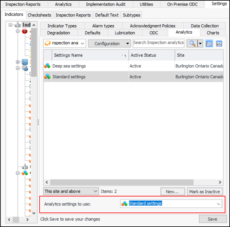 • The Inspection Reports tab provides charts showing inspection reports by time period and status for the current site. Select the Summary or Summary by Asset tab to view specific assets’ reports. Click a report’s icon to list reports for the asset and year. For example:To select the data to show and the time profile, select the Inspection Management view, Settings tab, Indicators tab, and then the Analytics tab. Click New to open the Inspection Analytics Settings dialog:You can name the settings, select the appropriate tabs to be displayed, and set the reporting horizons. After saving the settings, enable editing for the site, and select the new settings in the Analytics settings to use list:Marine Growth Analytics Chart