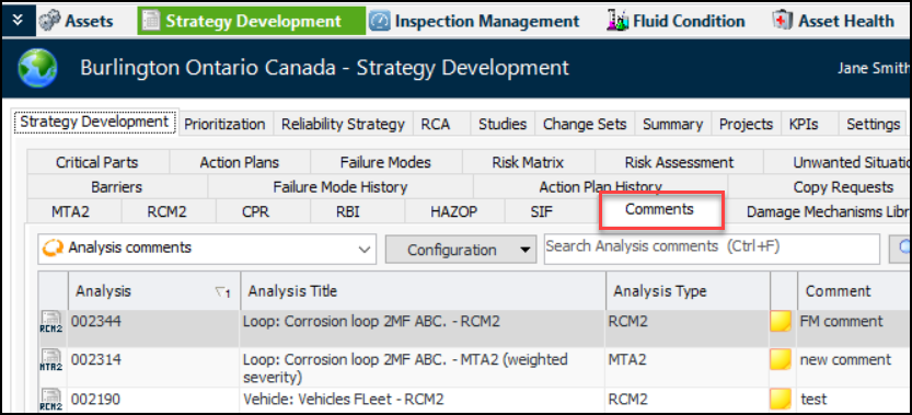 The site’s Strategy Development view now provides Comments tabs that compile the comments for all types of analyses. For example, on the Strategy Development tab, the Comments tab shows comments that were added to CPR, MTA2, RBI, RCM2, HAZOP, and SIF analyses.Select the Prioritization, Reliability Strategy, or RCA tab and then the Comments tab to view comments added to these types of analysis.