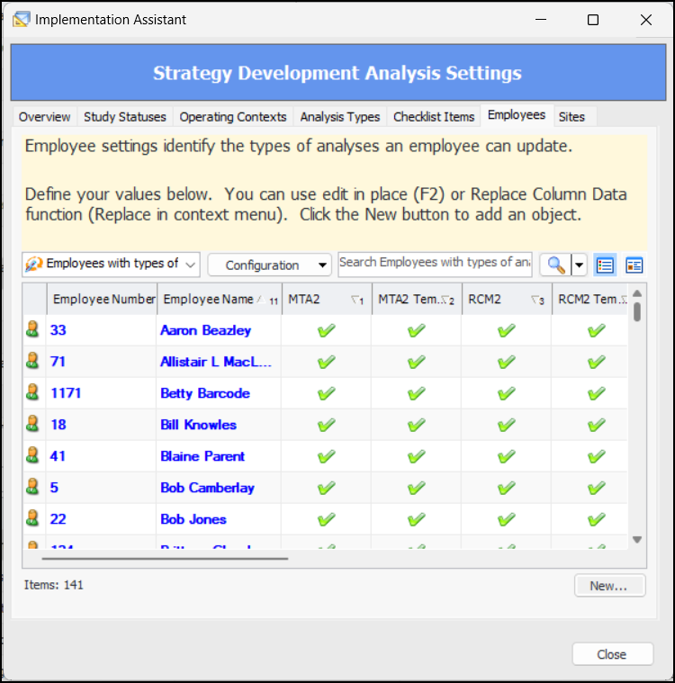 For more complex objects, such as sites, asset types, indicator types, alarm types, approval routes, and so on, the tabs display only information that is specific to the function being implemented. For example, in the Strategy Development Analysis Settings assistant, the Employees tab lists employees, shows their sites, and indicates the types of analyses they are allowed to update: