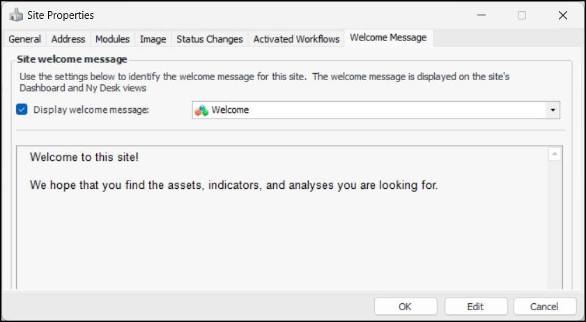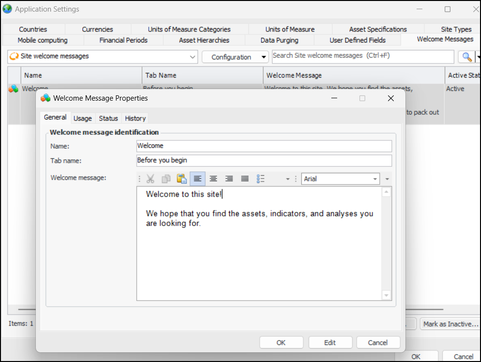 Welcome Message tab. Click
